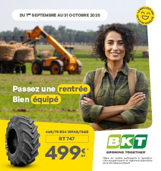 Promotion pneus Agricoles BKT Passez une rentrée bien équipé, du 1er septembre au 31 octobre, profitez de…